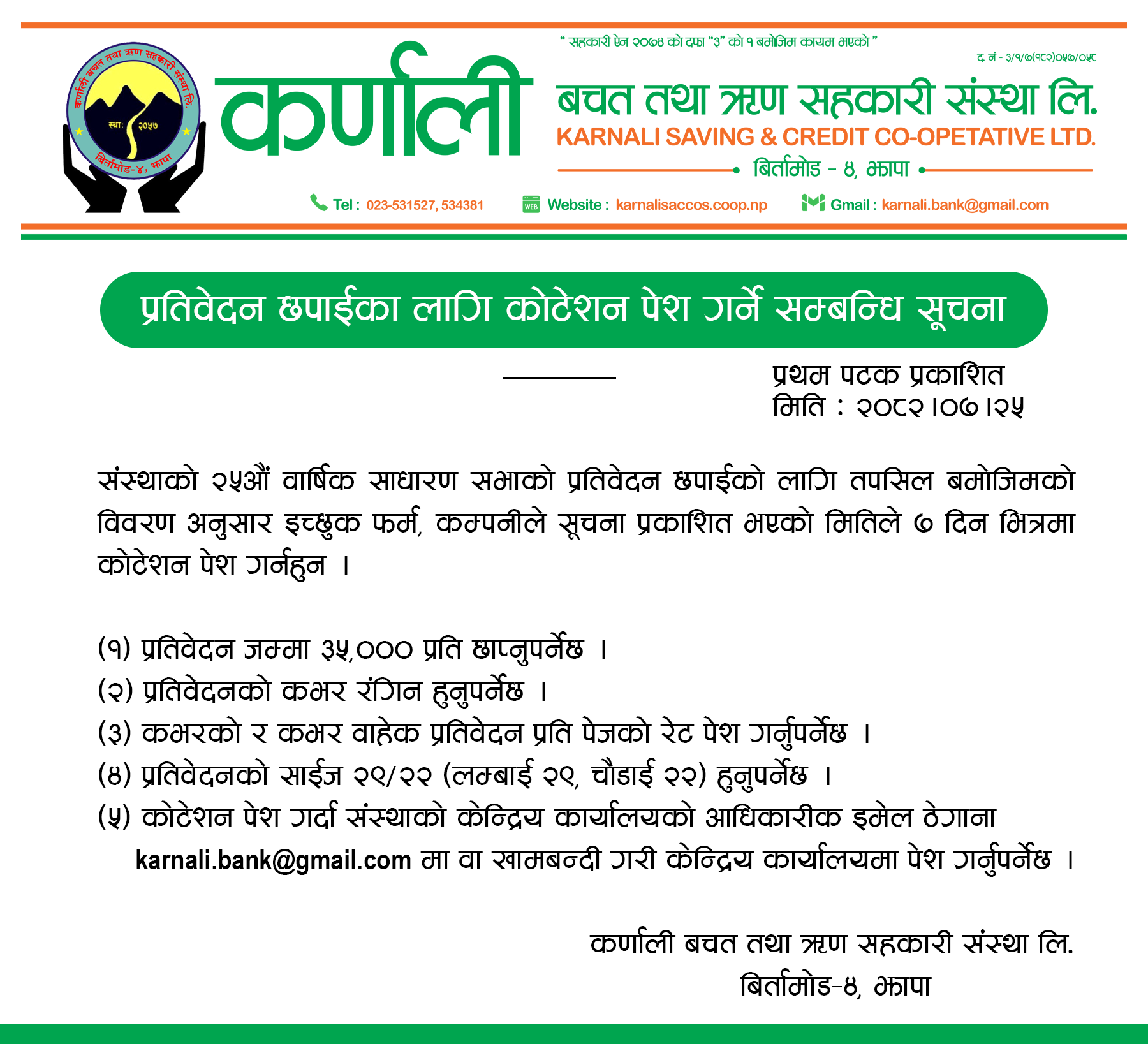 आदरणिय शेयर सदस्य तथा दाजुभाई, दिदी बहिनीहरुमा सहकारी अभिवादन गर्दछु । आज कर्णाली बचत तथा ऋण सहकारी संस्था लि. विर्तामोड ४ झापा तपाईहरुको असिम विश्वास, सहयोग र सुझावले सफलता पूर्वक २२ औ बसन्तको पाईला टेकिरहेको छ । यहाहरुको यस विश्वास र आस्थालाई अविचलित हुन नदिई अविछिन्न रुपमा संस्थालाई अगाडि बढाई रहने हामी प्रण गर्दछौं । संस्थाले आफ्ना सदस्यहरुको वित्तिय सेवाको विश्वासनियता मात्र नभएर उद्यमशिलता र रोजगारको लागि आवश्यक तालीम, सीप दिनका साथ सामाजिक सुरक्षाका सेवाहरुलाई पनि प्रभावकारी र विश्वासनियता बनाउन चाहान्छौं ।