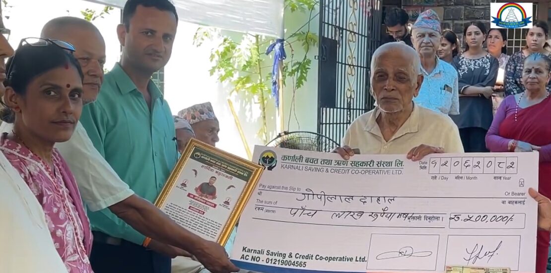 शेयर सदस्य स्वर्गीय श्री गोपी लाल दाहाल ज्यूको स्वर्गारोहणमा परिवारमा ५ लाख ४० हजारको सुबिधा वितरण