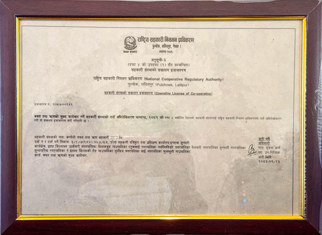 हाम्रो सहकारी संस्थाले राष्ट्रिय सहकारी नियमन प्राधिकरण, पुल्चोक, ललितपुर बाट सहकारी सञ्चालनका लागि आधिकारिक अपरेटिभ इजाजतपत्र प्राप्त गरेको महत्वपूर्ण अवसरमा यो तस्बिर सार्वजनिक गर्न पाउँदा हामी गर्व महसुस गर्दछौं।